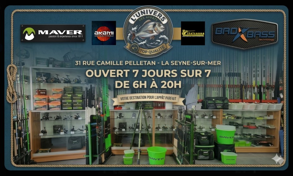 L'UNIVERS DES APPATS ( ORLANDO PECHE ) 31 RUE CAMILLE PELLETANT 83500 LA SEYNE SUR MER NOUS SOMMES OUVERT 7 SUR 7 DE 6H A 20H L'HIVER ET DE 5H30 A 21H L'ETE DES GRANDES QUANTITES ET SORTES D'APPATS TOUTE L'ANNEE NOUS SOMMES SPECIALISTE DU SURFCASTING ET TOUTES PECHE EN MER ESSAYEZ-NOUS !!!
